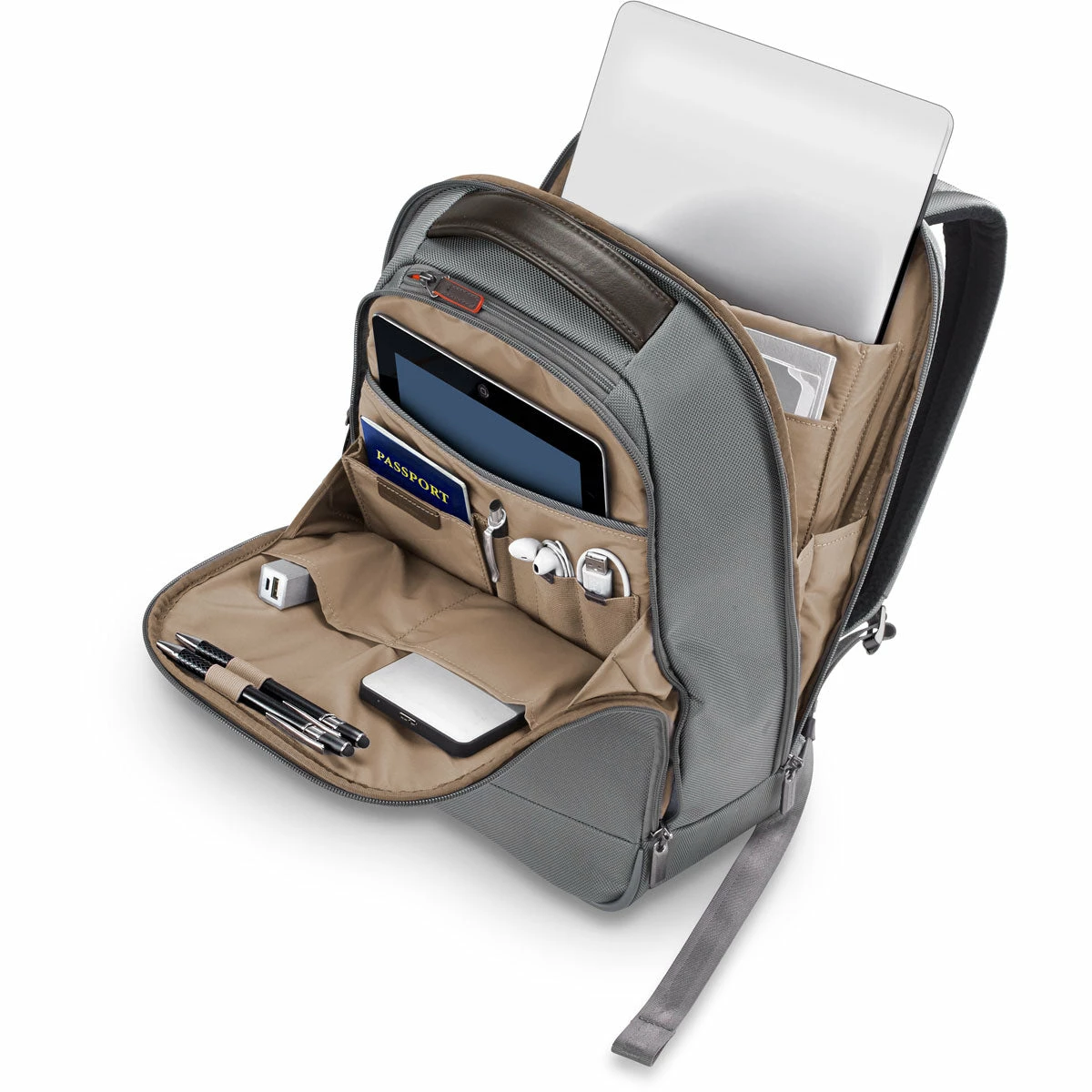 - Organizer and laptop compartments feature dual zipper pulls that can be used with a cable lock to protect contents