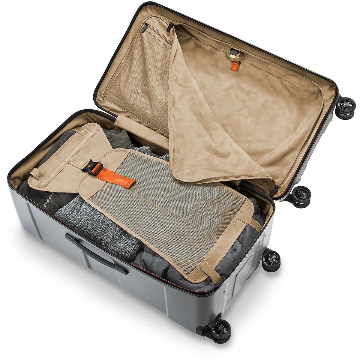 - Cinch-down garment panels with simple, single-strap buckle closure secures clothes in place, minimizing shifting in transit and reducing wrinkles.