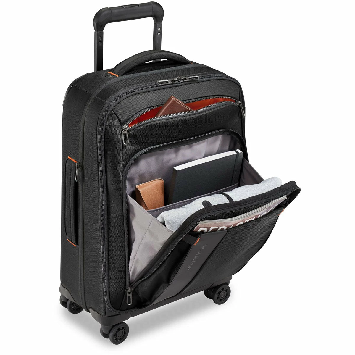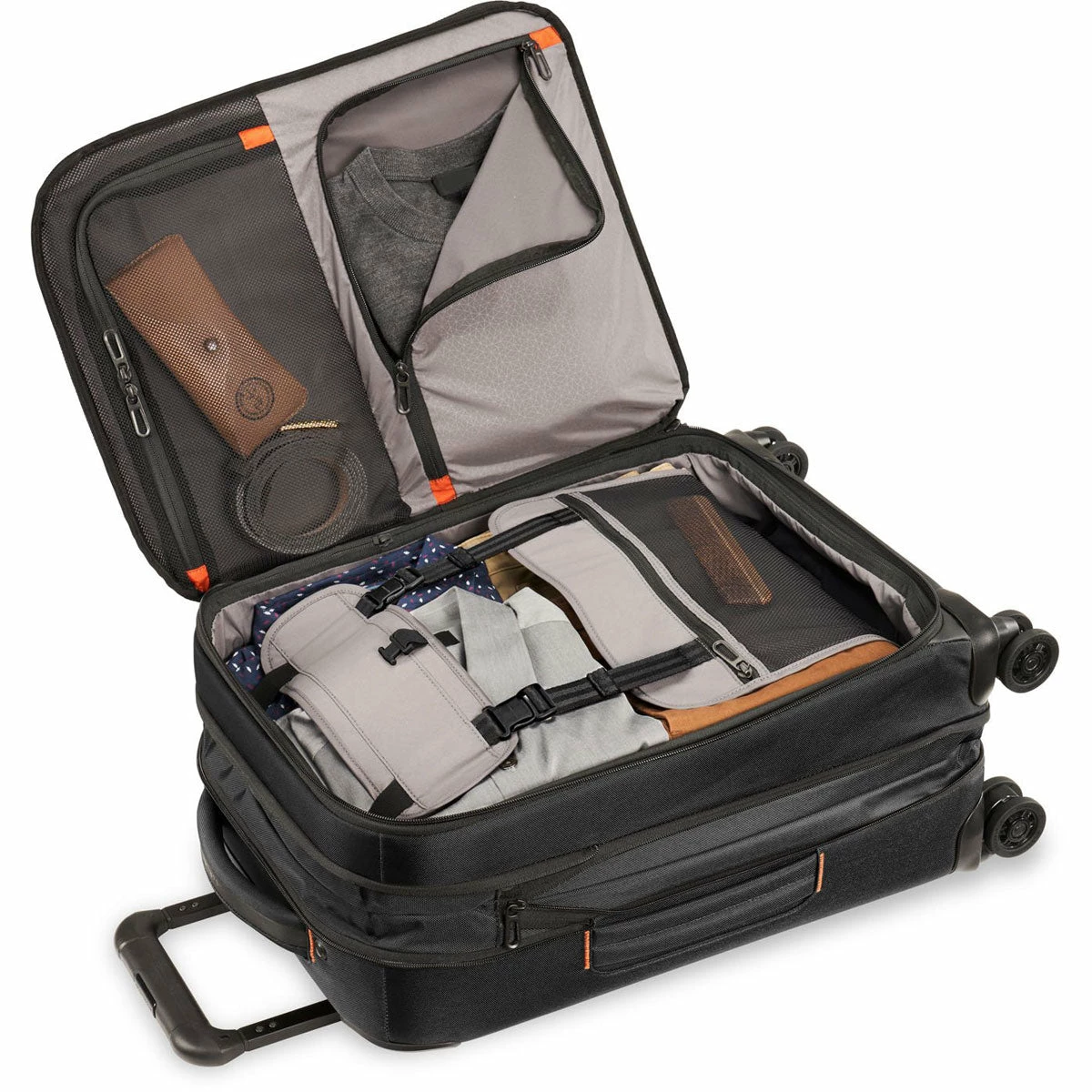 - Patented Outsider® handle for wrinkle-free flat packing and greater interior packing capacity