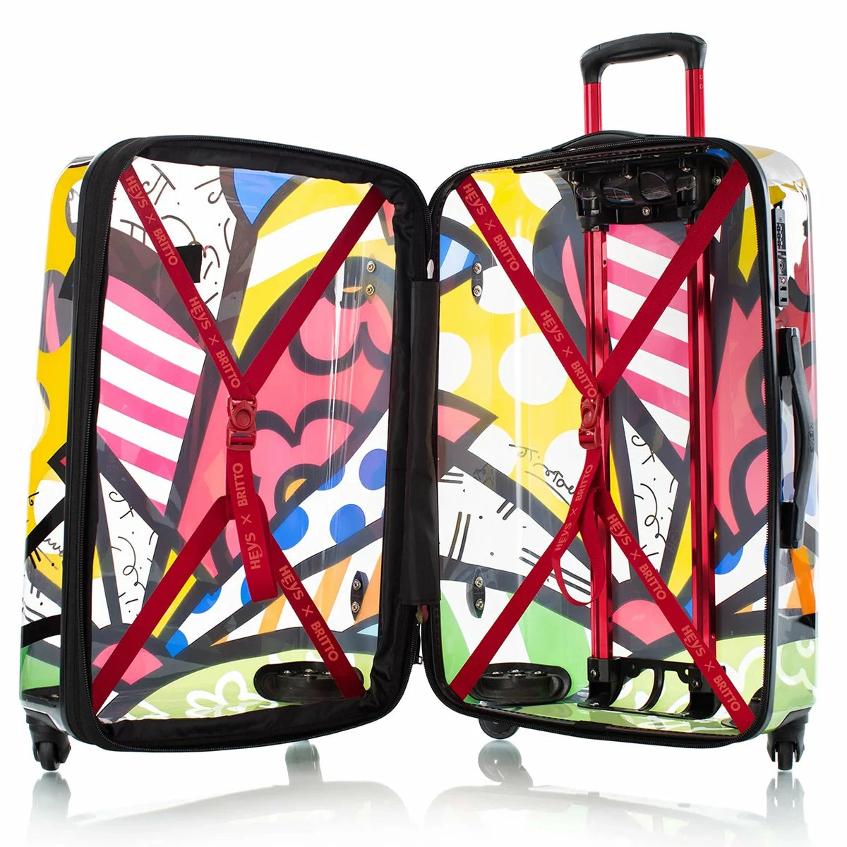 The Britto A New Day TRANSPARENT 26″ Expandable Spinner by Romero Britto is part of a Limited Edition Series of luggage. Born in Brazil, Romero Britto is a Florida-based neo-pop artist, painter, serigrapher, and sculptor. Combining elements of pop art and graffiti painting, Britto’s signature style is recognized worldwide.