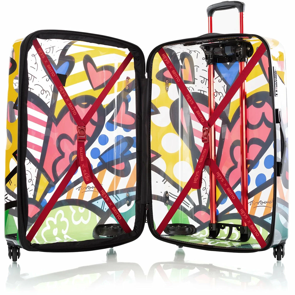 Britto A New Day TRANSPARENT 30″ Expandable Spinner by Romero Britto is part of a Limited Edition Series of luggage. Born in Brazil, Romero Britto is a Florida-based neo-pop artist, painter, serigrapher, and sculptor. Combining elements of pop art and graffiti painting, Britto’s signature style is recognized worldwide.