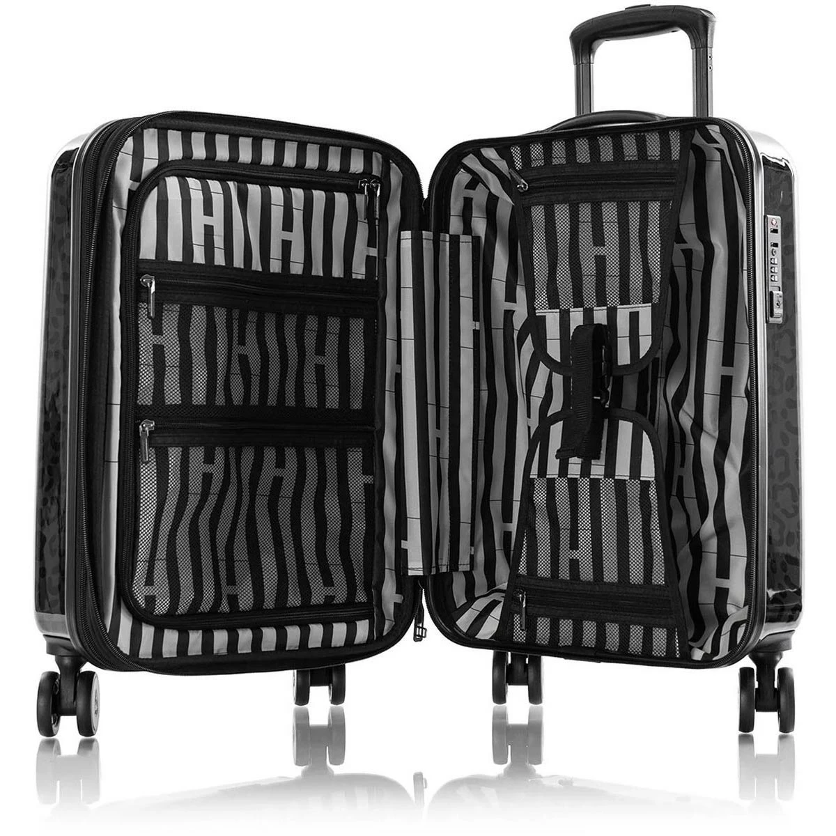 The Heys Black Leopard 21″ Fashion Spinner is the next generation of Heys popular ‘Fashion Spinners®’ luggage – it’s been completely redesigned from the ground up with all-new features! It’s made from a lightweight, durable and impact-resistant material that features a trendy Black Leopard print. It has a fully lined interior with stylish patterned fabric, multiple zippered pockets and allows for an extra 20% in capacity when the expansion system is unzipped. The robust 360° spinner wheels allow for effortless motion in different terrains and the top and side handles are gel cushioned for extra comfort.