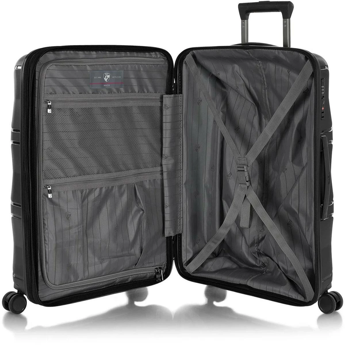 The Heys Milos 26″ Expandable Spinner is lightweight and impact resistant able to withstand a 750lb impact without breaking. Available in five stylish metallic colors with a subtle dual textured shell for a striking appearance. It features a fully-lined interior with zippered divider, buckled compression straps and zippered pockets as well as an expansion system that allows for an extra 20% in packing capacity. The 360° spinner wheels allow for effortless motion in different terrain and the flush mounted built-in color matched TSA approved combination lock help keep your valuables safe.