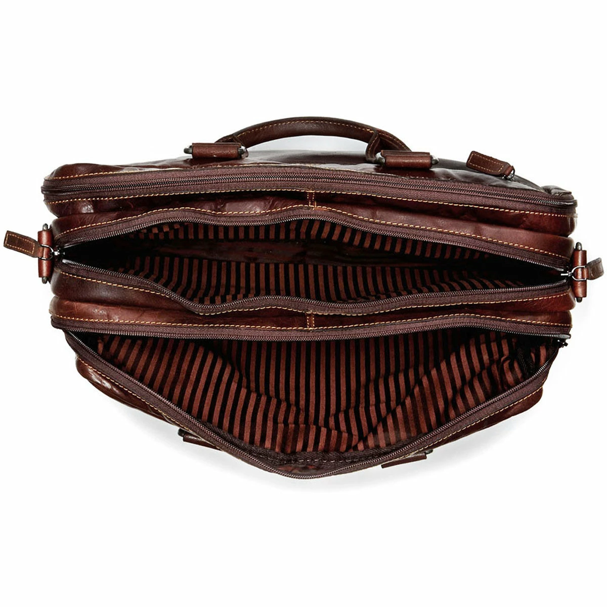 Jack Georges Voyager Large Travel Briefcase will carry your laptop and keep your files, folders, and accessories organized. It has a three-way zip back compartment that can be used to hold an extra outfit for an overnight trip. The bag’s soft, smooth, hand-stained buffalo leather builds a rich, beautiful patina as it ages. The briefcase features top zip closure and a padded compartment that holds laptops with up to 17″ screens. It has a large zippered pocket on the front and back of the bag to keep items that you need – like your wallet, phone, or travel documents – secure but still close at hand when you’re on the go. There is also a trolley strap in the back to attach to any wheeler while you’re traveling. Inside of the bag is an organizer with pockets to hold your essentials and a full-length zippered pocket for documents and items that you want to keep separate. The back compartment has elastic straps to secure an extra set of clothes and a large zippered mesh pocket to hold personal items. Use the D-ring on the side of the bag to attach your keys, umbrella, or other necessary items with your carabiner. The adjustable leather shoulder strap has webbing on the backside for added strength and will hold onto your shoulder while remaining comfortable to wear. The bag features: