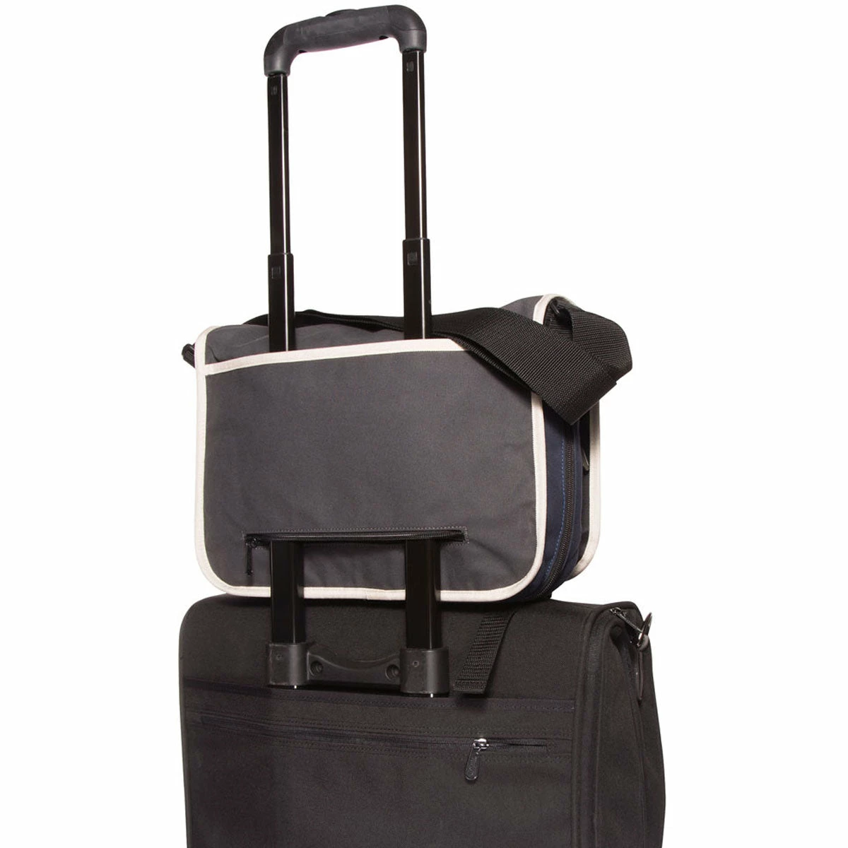 - Back pocket can be unzipped and used to attach bag to piece of rolling luggage
