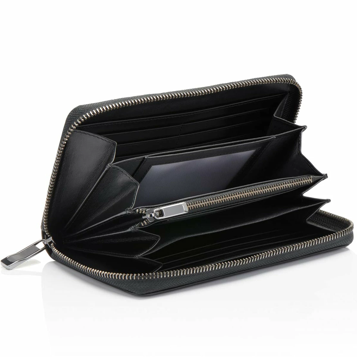 High-quality, shiny smooth leather in black, seamlessly created exteriors and the characteristic metal Porsche Design logo plate give the Porsche Design Classic Wallet 15 with Zipper a timeless and minimalistic style. The high-quality interior is in line with the smart design:Â The men’s wallet with an all-around zipper amazes with its extremely spacious interior design. The wallet offers the maximum amount of space for all important cards and receipts with 15 credit card slots, a zipper compartment for coins, four spacious compartments for documents, a mesh compartment for your ID and two bill compartments.