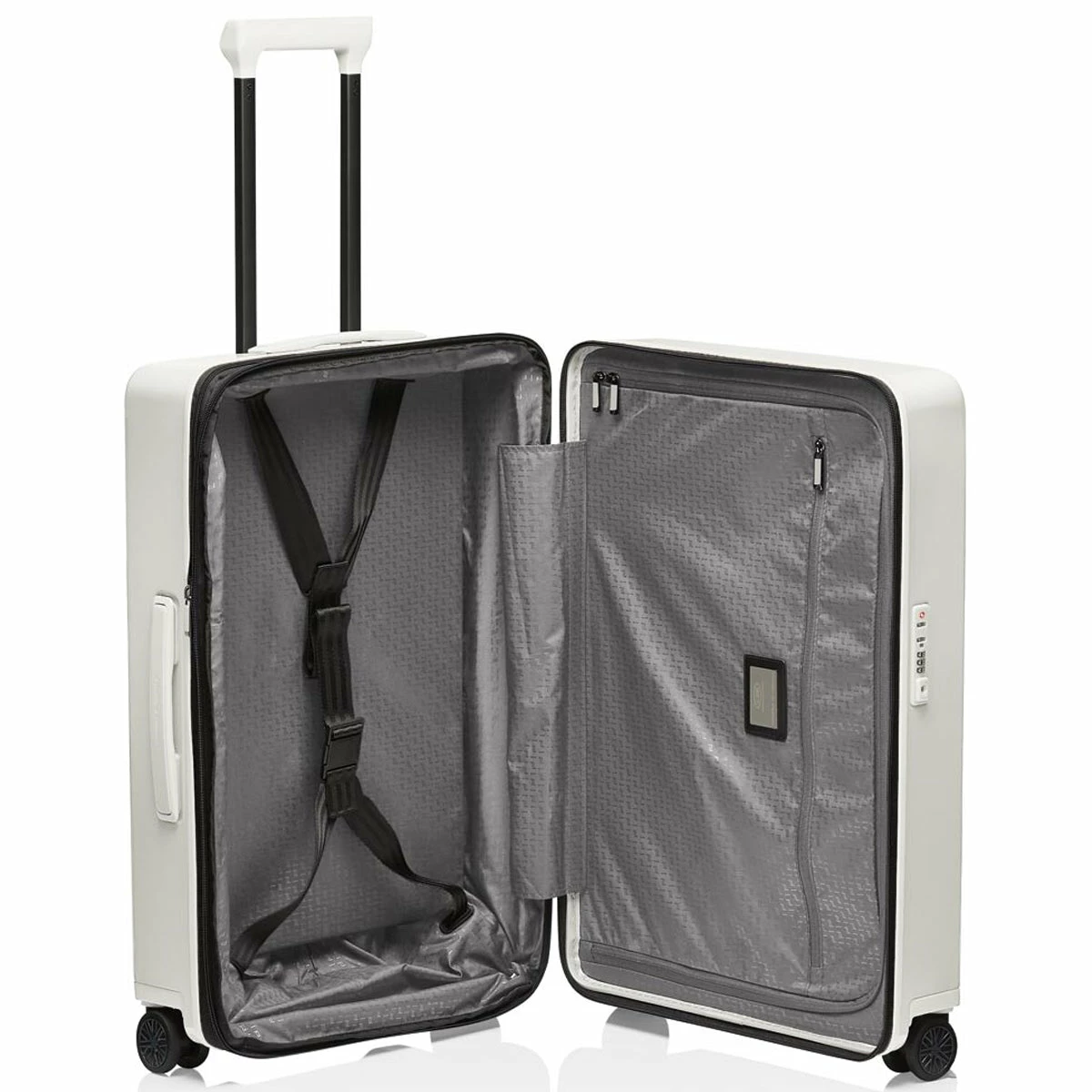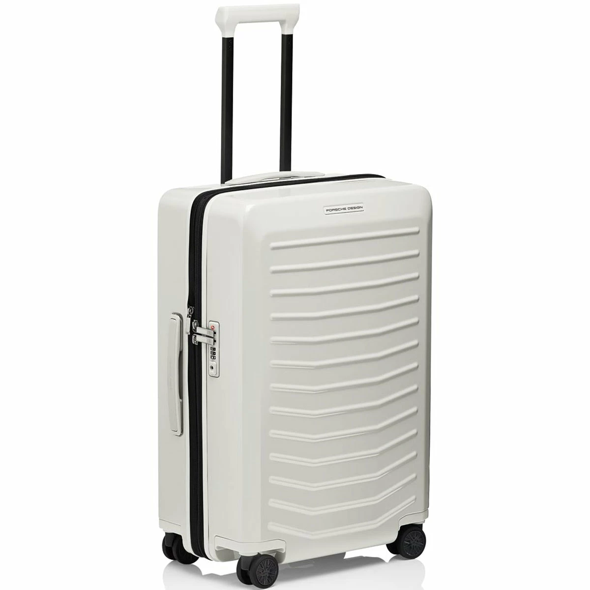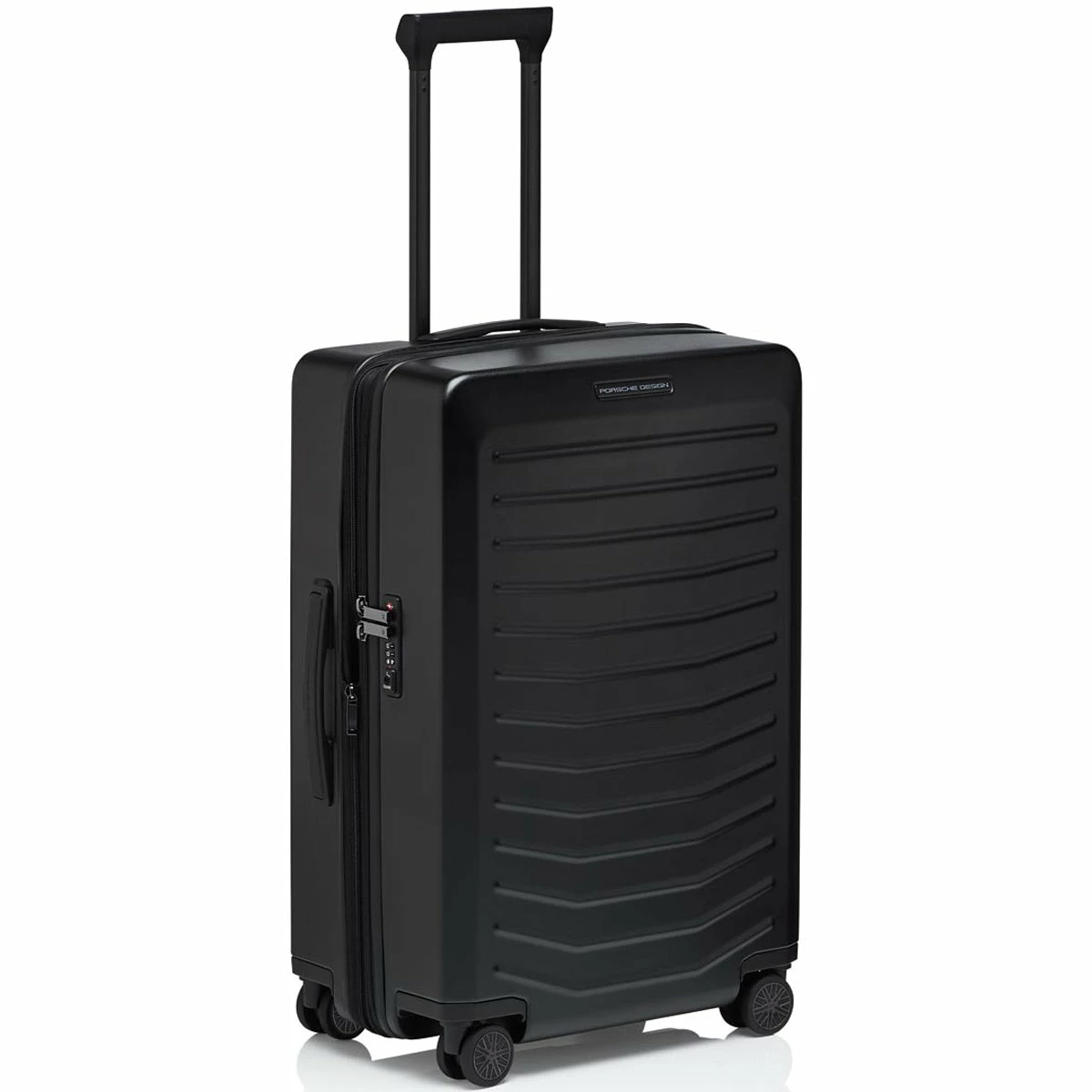 Ball bearing, smooth-rolling wheels in the style of Porsche Taycan rims and a multi-step, ergonomic handle provide for the perfect performance. Through the rounded edges of the handle, bags can be easily attached and removed. The divided interior is also flexible – and can be expanded at any time. An ultra-secure two-way zipper and a TSA lock protect your luggage.