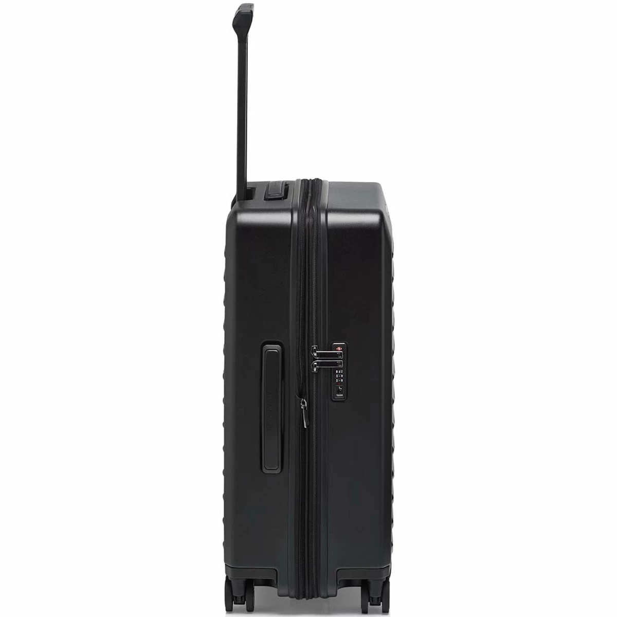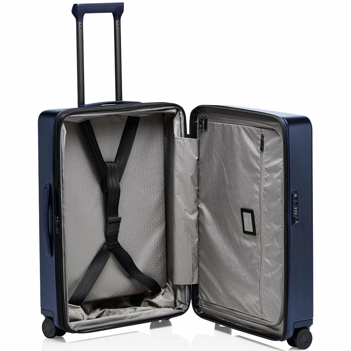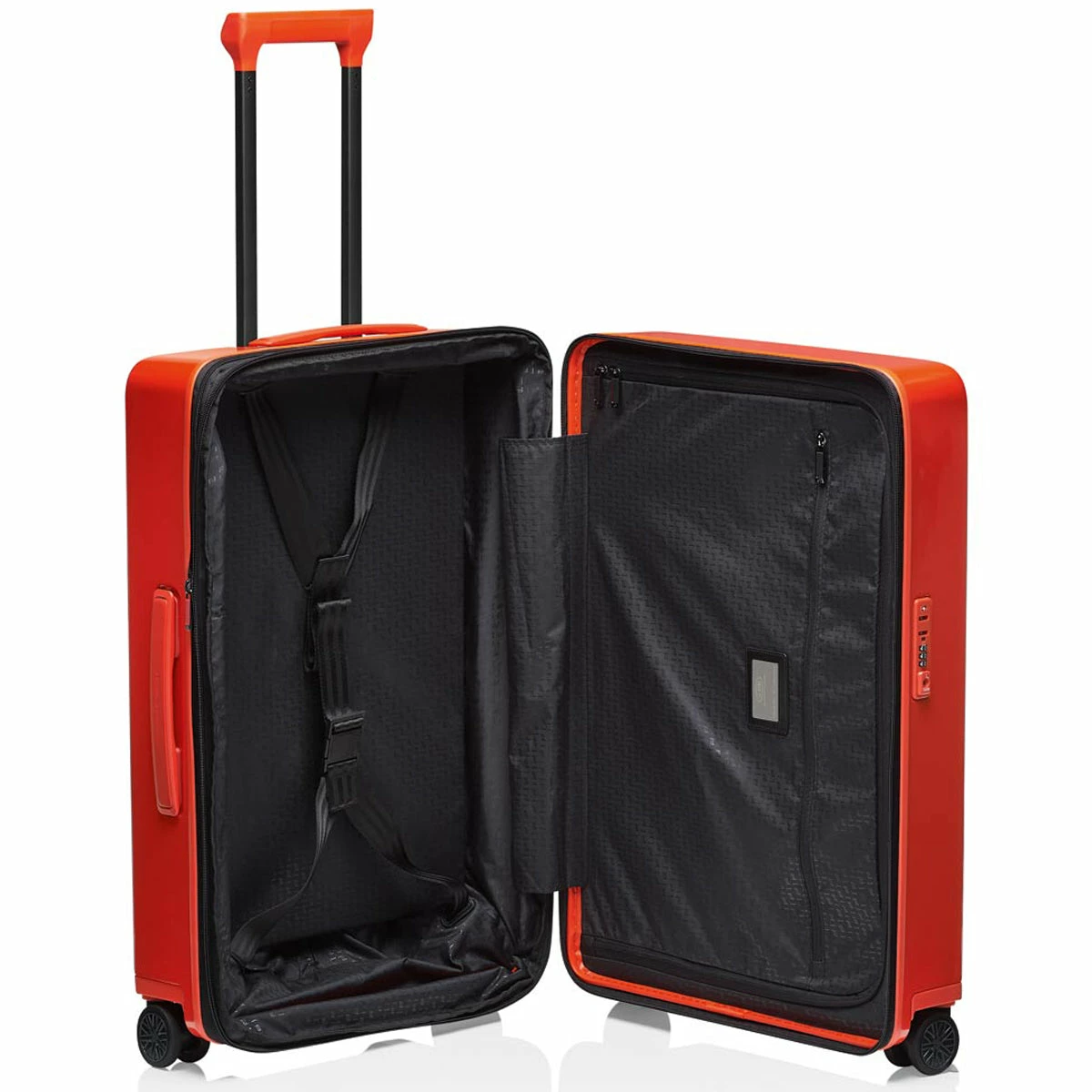 Ball bearing, smooth-rolling wheels in the style of Porsche Taycan rims and a multi-step, ergonomic handle provide for the perfect performance. Through the rounded edges of the handle, bags can be easily attached and removed. The divided interior is also flexible – and can be expanded at any time. An ultra-secure two-way zipper and a TSA lock protect your luggage.