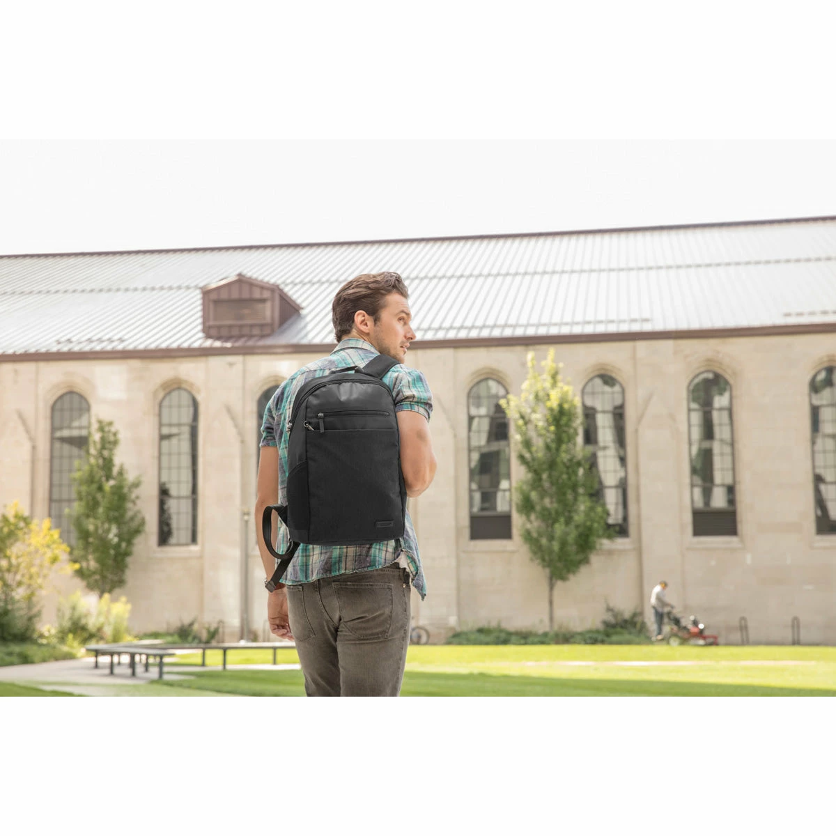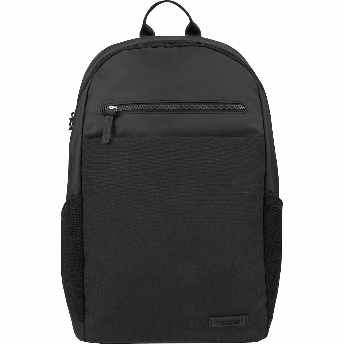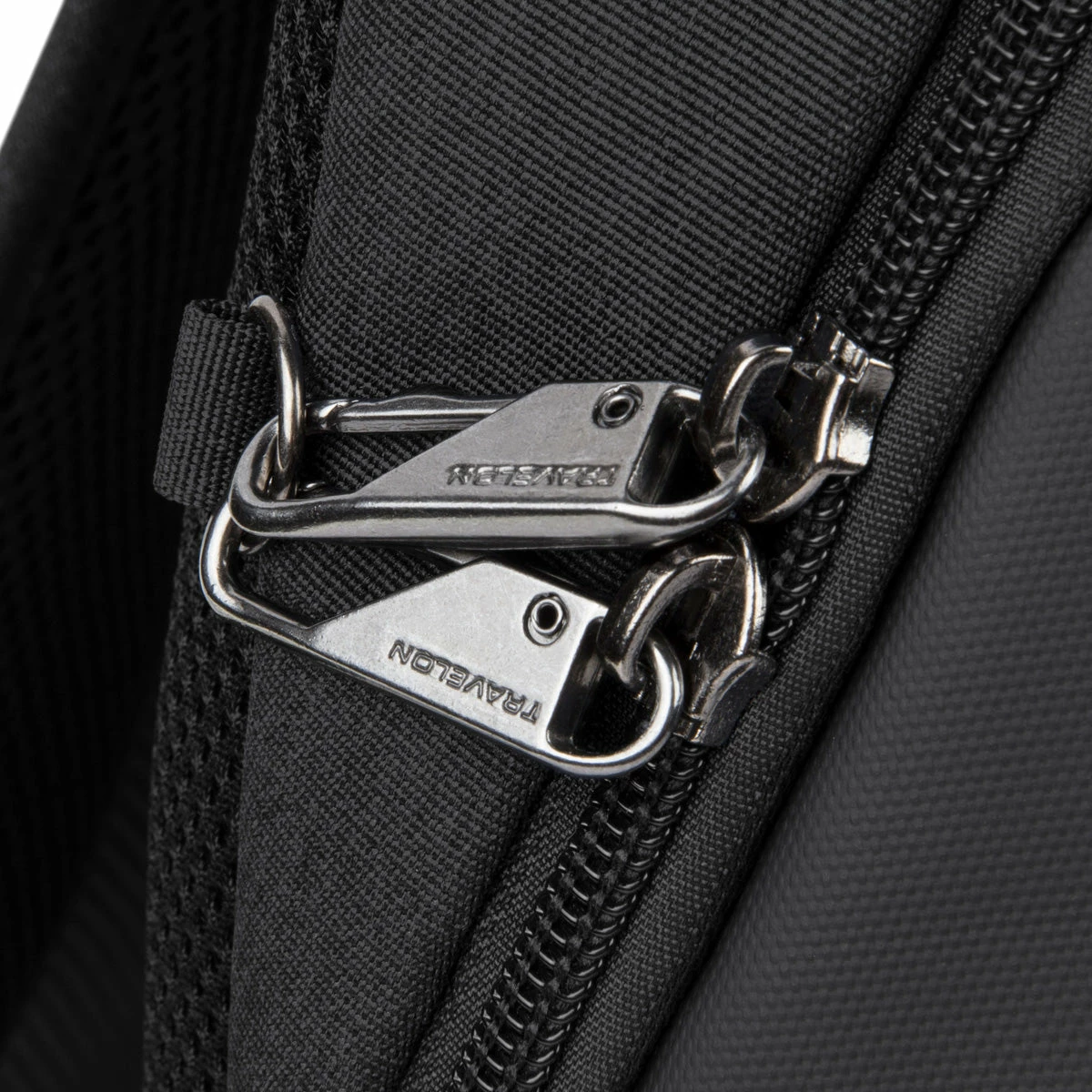 - Full Anti-Theft features include surround slash-resistant body panels and shoulder strap; locking compartments; lockdown strap; and RFID blocking card and passport slots and pockets