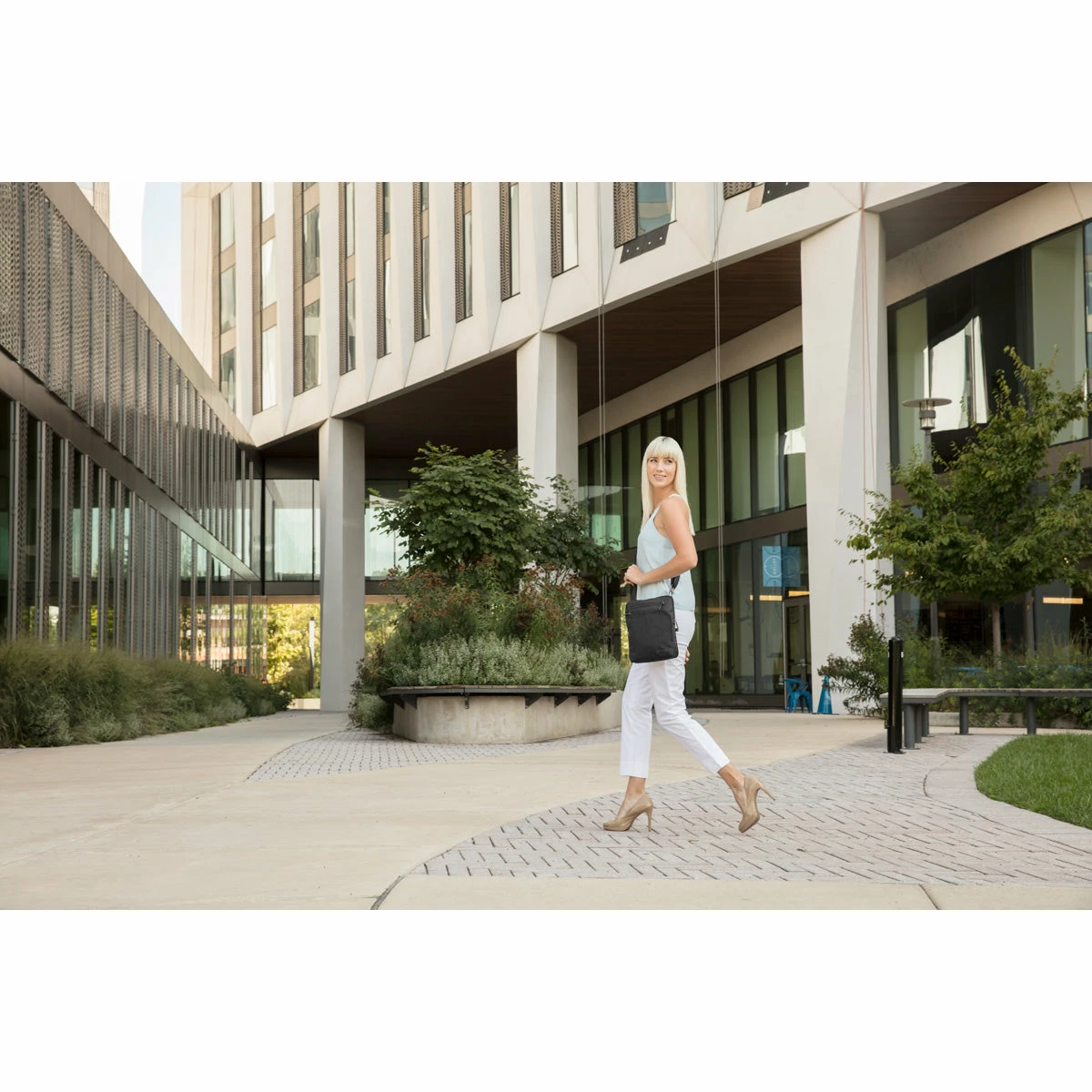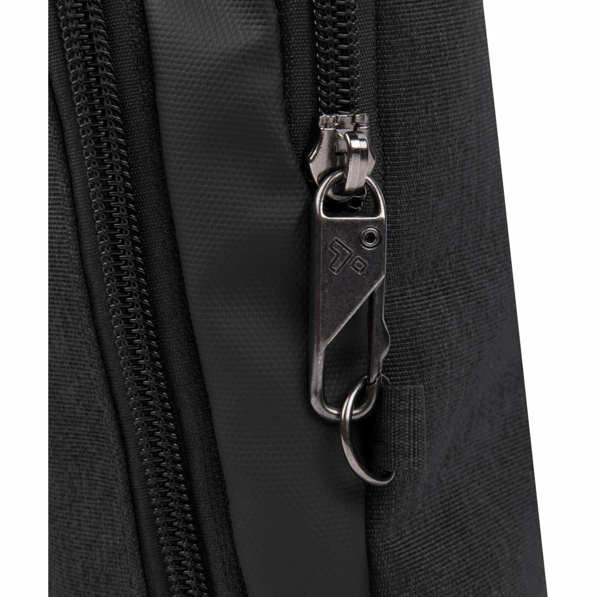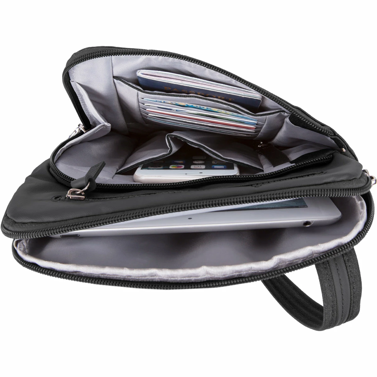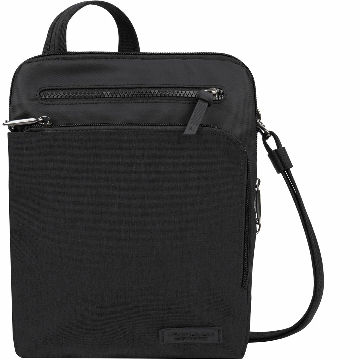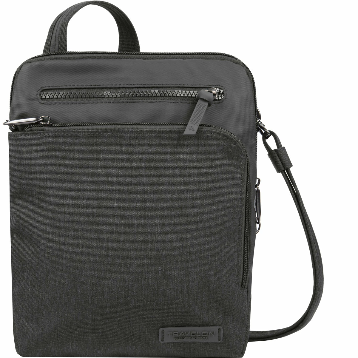 - Full Anti-Theft features include surround slash-resistant body panels and shoulder strap; locking compartments; lockdown strap; and RFID blocking card and passport slots and pockets