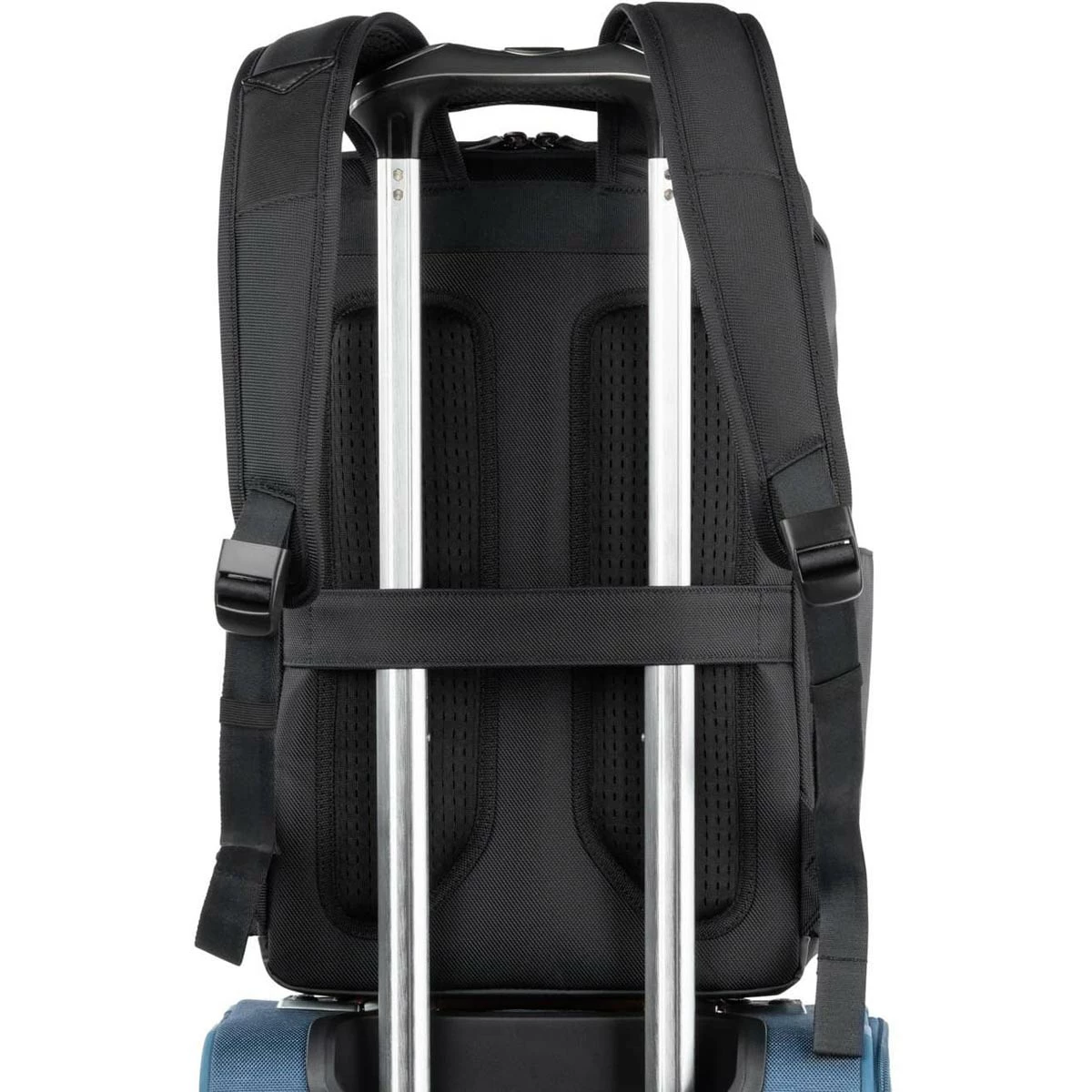 -  When it’s time to move, the padded airflow back panel and adjustable, padded shoulder straps provide superior comfort and a dedicated strap pocket for earbud storage. For hands-free mobility, an unobtrusive rear stacking strap fits around the extension handle of any Rollaboard® or spinner suitcase