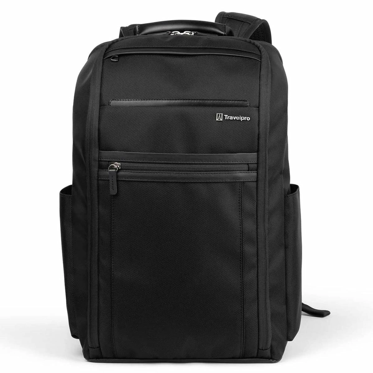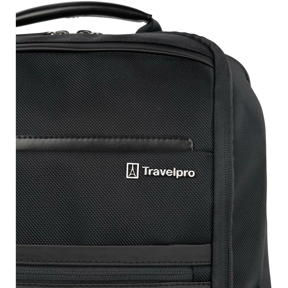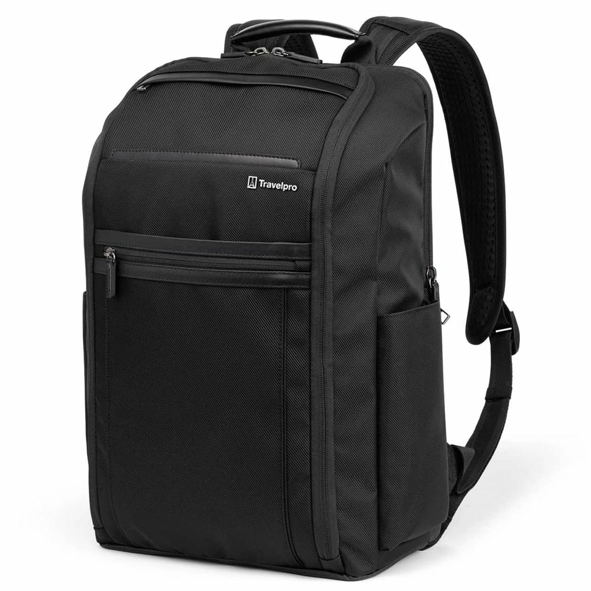 - Crafted with high-quality, stain-resistant nylon fabric and leather accents, this Slim Backpack makes ultimate use of its pared down profile with separate padded tablet and laptop sleeves plus loads of pockets inside and out. Special features include a tricot-lined, exterior top-zip sunglass pocket and Travelpro® QuickSlip™ front pocket with magnetic closure, perfect for cellphone storage on the run. A Travelpro® ID TheftBlock™ pocket keeps credit cards and passports protected against loss and identity theft, and exterior, lie-flat side pockets expand to hold water bottles or an umbrella.