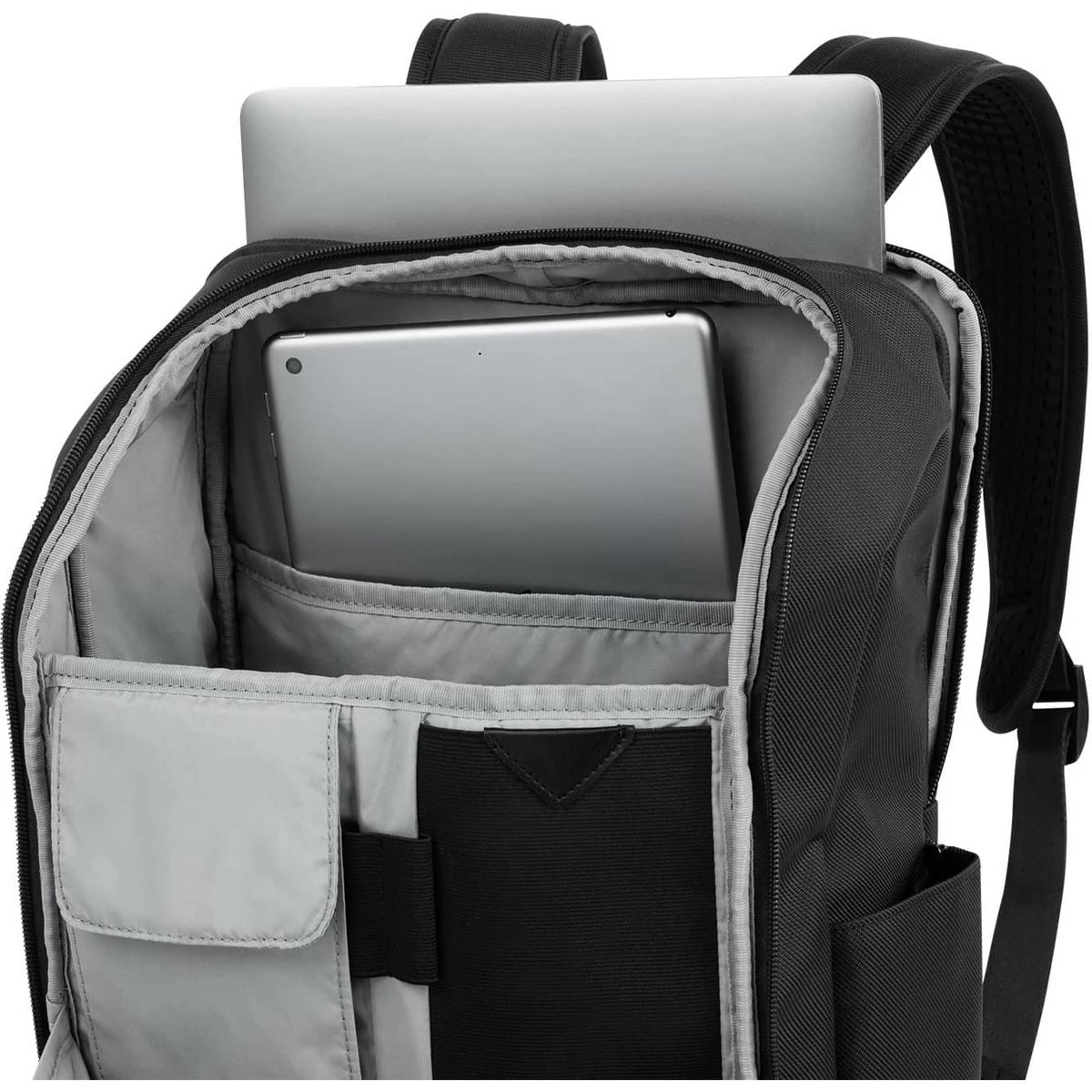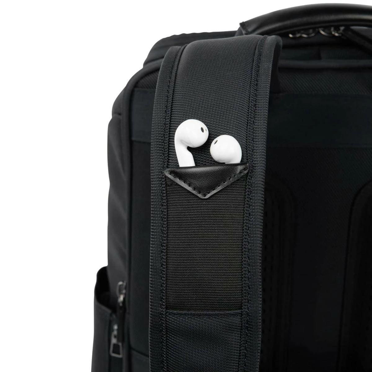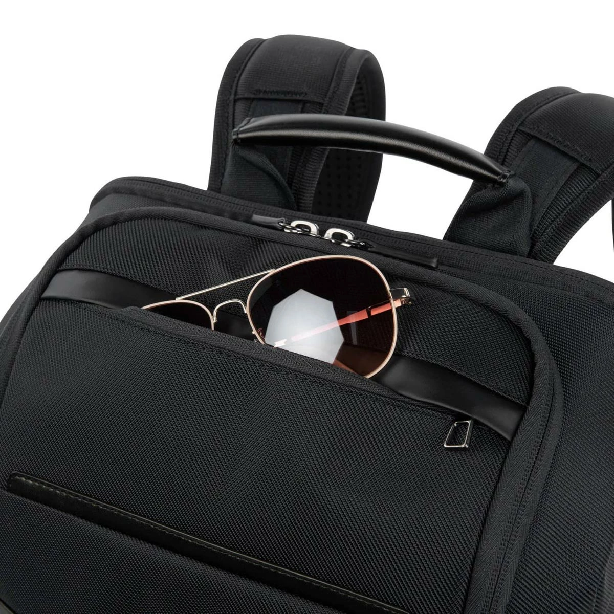 - Crafted with high-quality, stain-resistant nylon fabric and leather accents, this Slim Backpack makes ultimate use of its pared down profile with separate padded tablet and laptop sleeves plus loads of pockets inside and out. Special features include a tricot-lined, exterior top-zip sunglass pocket and Travelpro® QuickSlip™ front pocket with magnetic closure, perfect for cellphone storage on the run. A Travelpro® ID TheftBlock™ pocket keeps credit cards and passports protected against loss and identity theft, and exterior, lie-flat side pockets expand to hold water bottles or an umbrella.