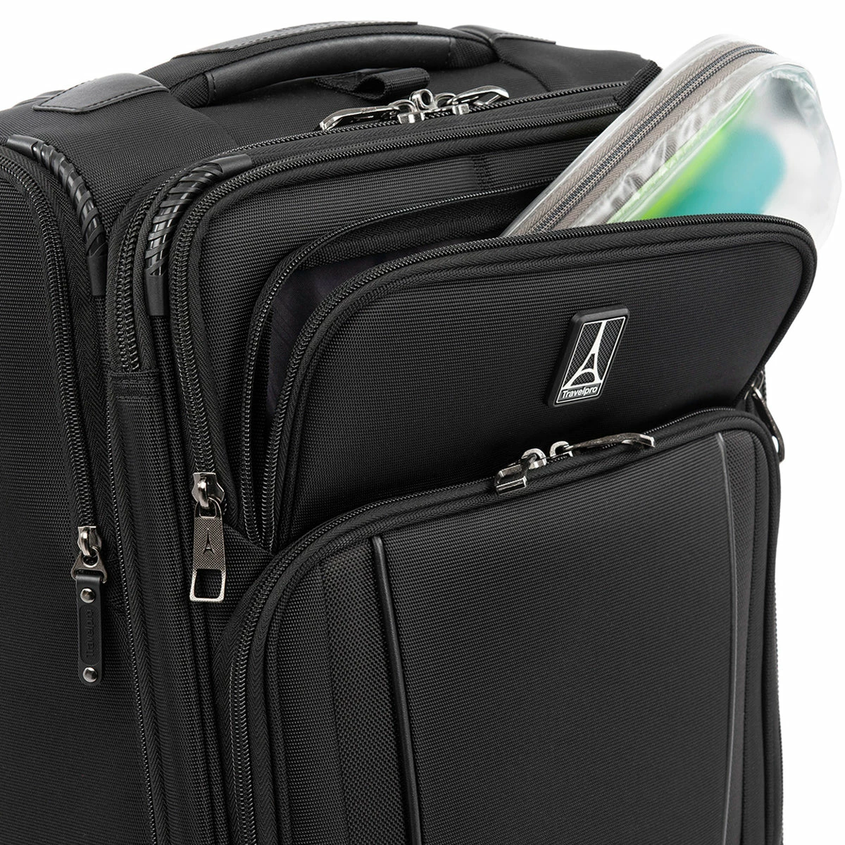 - Removable, TSA-compliant toiletries bag stores perfectly in a dedicated exterior pocket