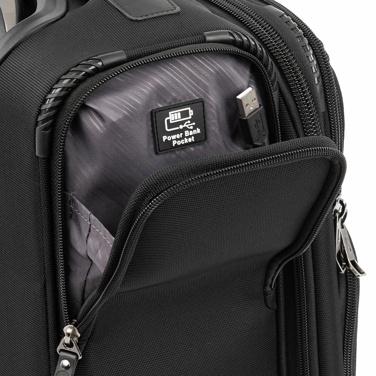 - Exterior power bank pocket provides FAA-compliant power connected to an external USB Port (battery not included)