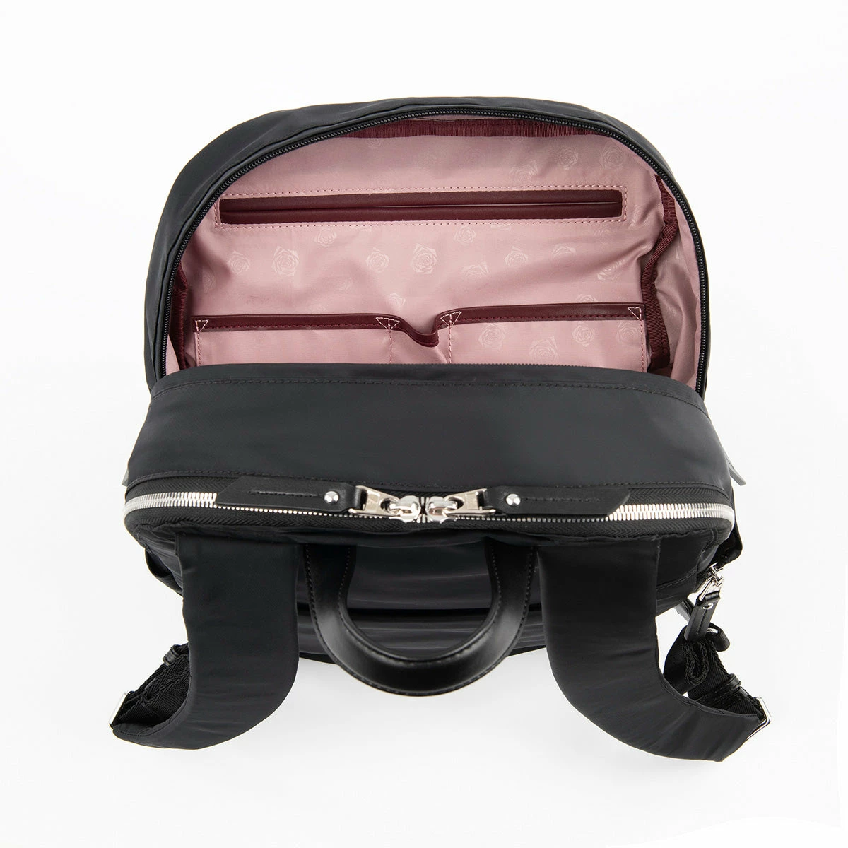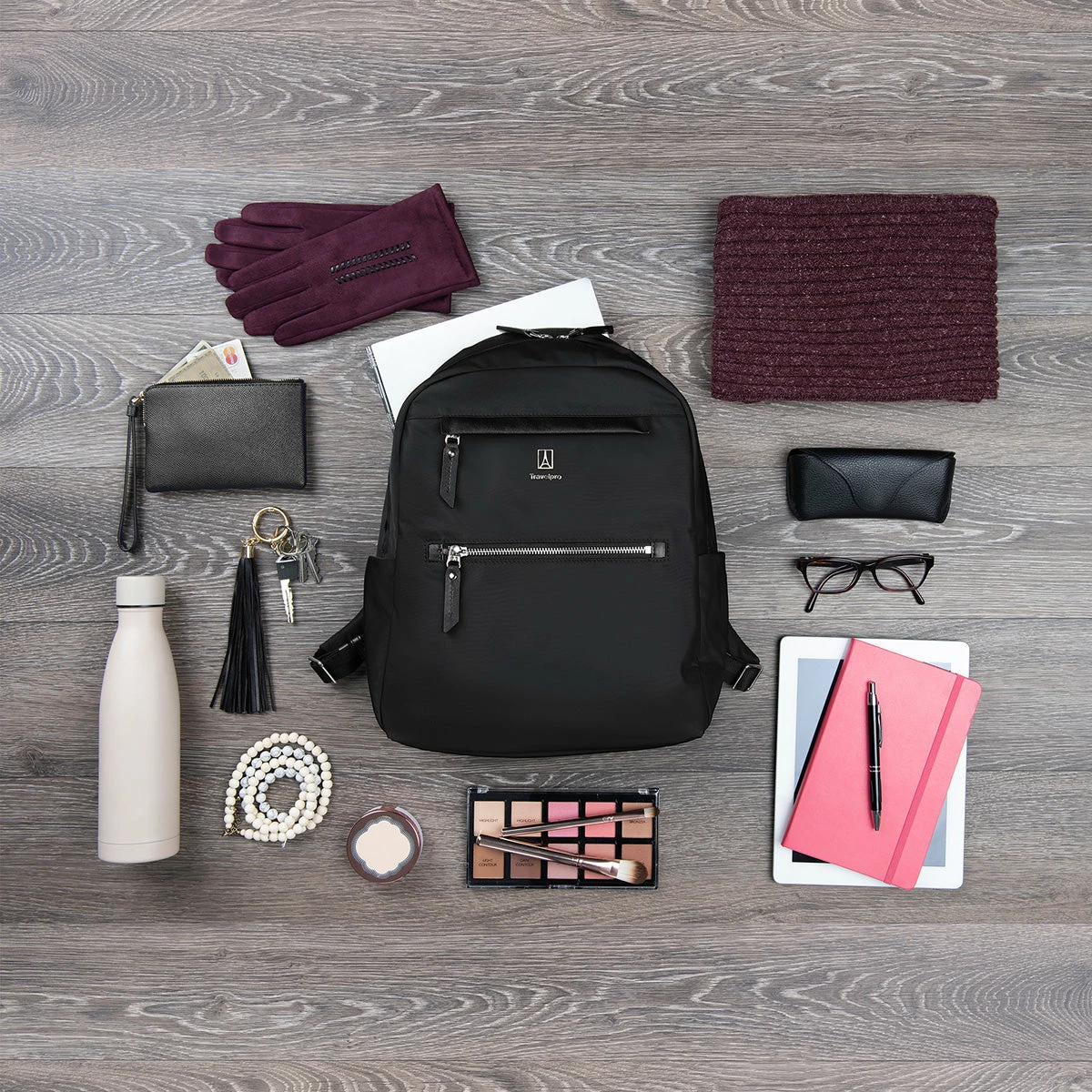 The Platinum® Elite Women’s Backpack from Travelpro® exceeds expectations. This elegantly-styled slim design delivers big on capacity with built-in padded laptop and tablet sleeves and numerous organizing compartments. Multiple exterior pockets offer quick access to a water bottle or other grab-and-go essentials, and a discreet, exterior Travelpro® QuickSlip™ pocket with magnetic closure is ideal for keeping your cell phone secure while going through airport security or catching your next business meeting.
