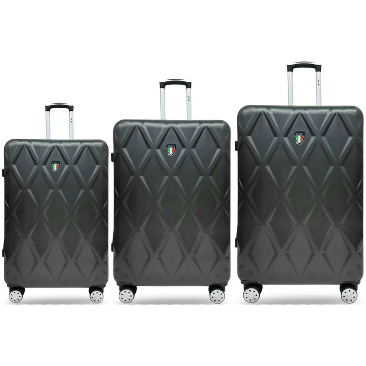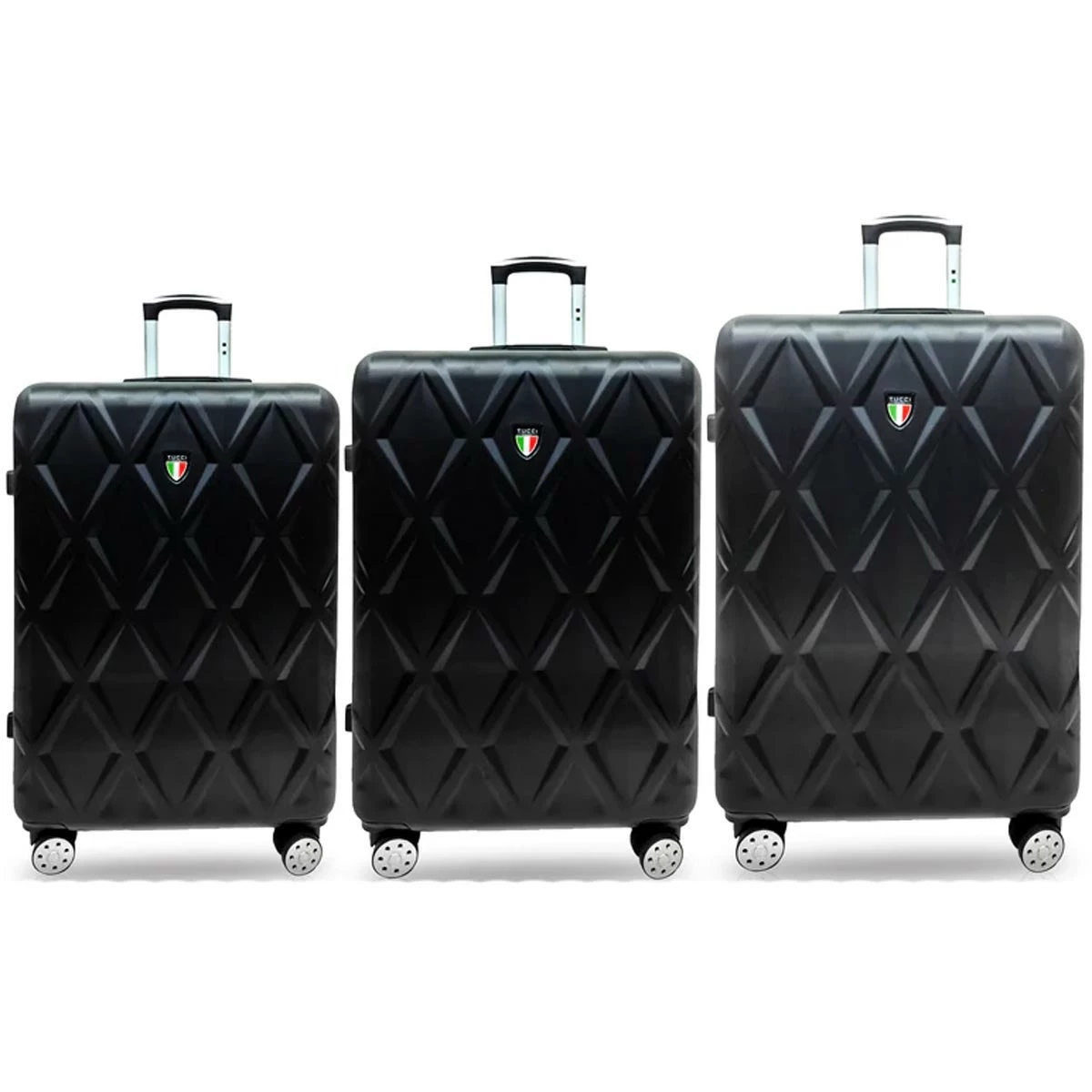 Designed in Italy, the Tucci Alveare T0328 ABS 3pc Luggage Set features three upright, hardside spinners, complete with 3-dial combination locks, lightweight, durable, textured ABS shells, and smooth rolling spinner wheels. With the microdiamond textured finish, your luggage will turn heads on your next trip.