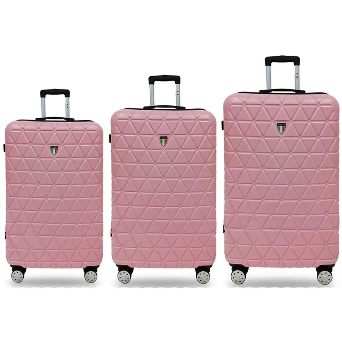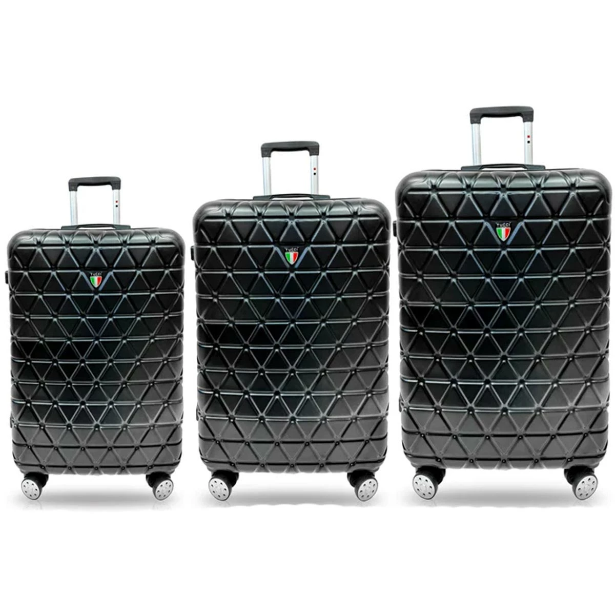 Designed in Italy, the Tucci Tessere T0325 ABS 3pc Luggage Set features three upright, hardside spinners, complete with 3-dial combination locks, lightweight, durable, textured ABS shells, and smooth rolling spinner wheels. With the microdiamond textured finish, your luggage will turn heads on your next trip.
